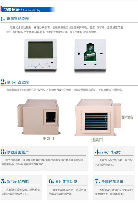 2、特制機身安裝隱蔽在吊頂之中,不影響室內裝修的效果,又能達到抽濕的目的。